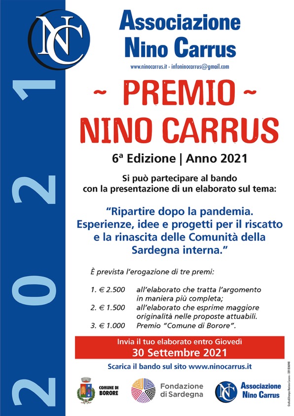 L'Associazione Nino Carrus, da anni impegnata sul piano politico e culturale con particolare attenzione alle tematiche inerenti lo sviluppo locale, la sensibilizzazione sociale e la promozione territoriale, presenta la Sesta Edizione del "Premio Nino Carrus 2021" finalizzata alla realizzazione di un elaborato dal titolo "Ripartire dopo la pandemia. Esperienze, idee e progetti per il riscatto e la rinascita delle comunità della Sardegna interna."