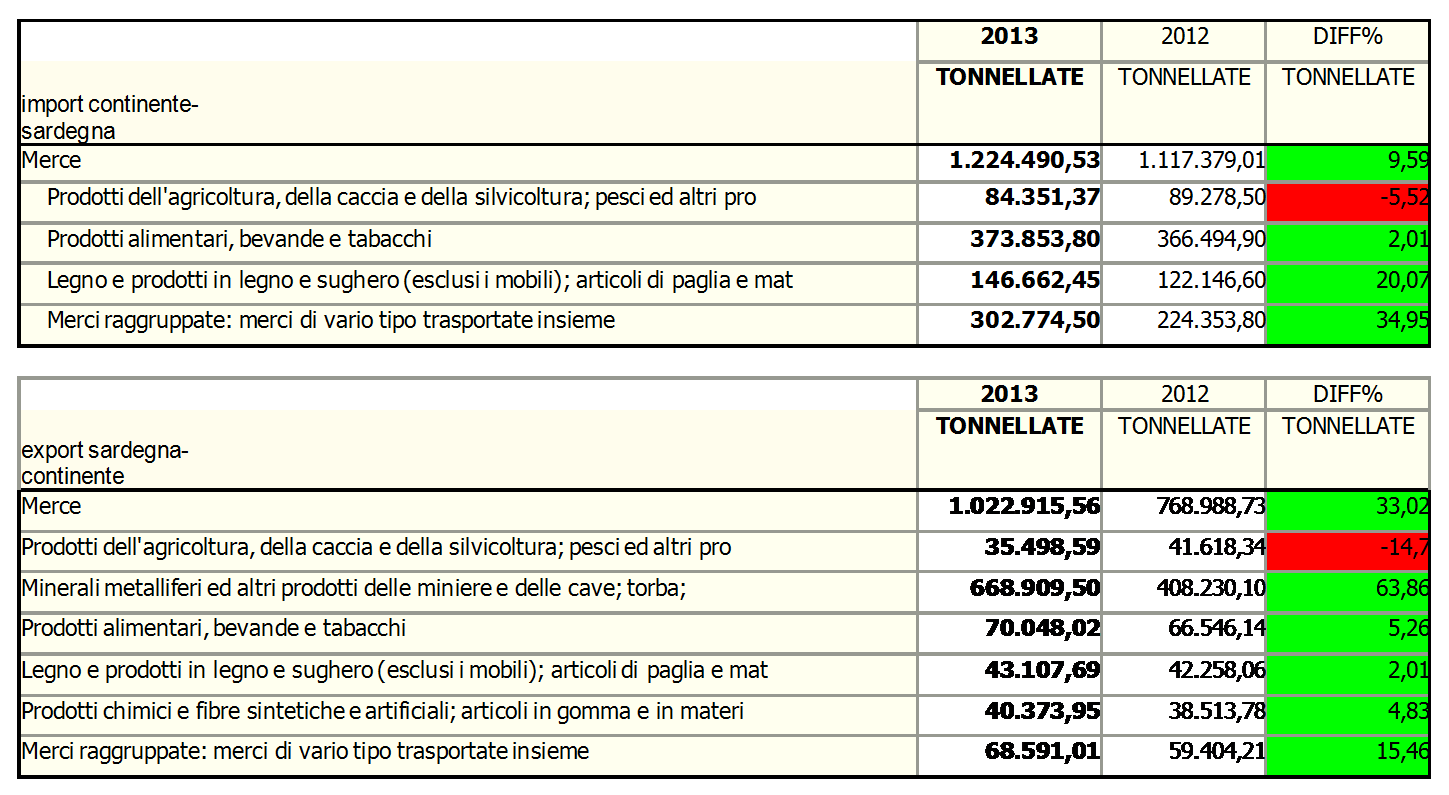 Il confronto di un campione significativo del movimento di merci in alcune aree della Sardegna evidenzia le differenze di volumi fra import ed export, con particolare rilevanza nei settori dove l'impianto logistico è determinante: