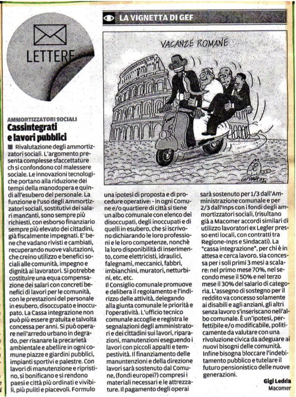 Lettera pubblicata su La Nuova Sardegna del 28/03/2014. Rivalutazione degli ammortizzatori sociali. L'argomento presenta diverse sfaccettature che si confondono col malessere sociale. Le innovazioni tecnologiche che portano alla riduzione dei tempi della manodopera e quindi all'esubero del personale.