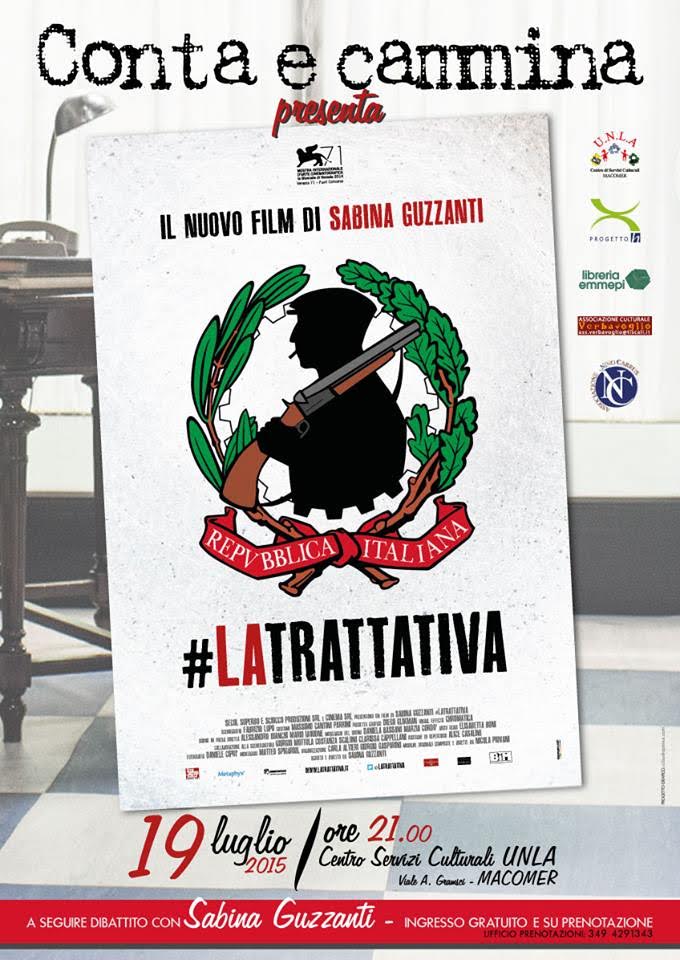 Il prossimo 19 luglio sarà il giorno della commemorazione nazionale della strage di Via D'Amelio, dove persero la vita Paolo Borsellino e 5 agenti della sua scorta, tra cui la sarda Emanuela Loi. In seno alle iniziative legate al Festival della Legalità "Conta e cammina. La legalità appartiene al tuo sorriso" abbiamo scelto di ricordarli con la proiezione del film "La Trattativa" di e con Sabina Guzzanti che sarà presente in sala e parteciperà al dibattito successivo alla proiezione.