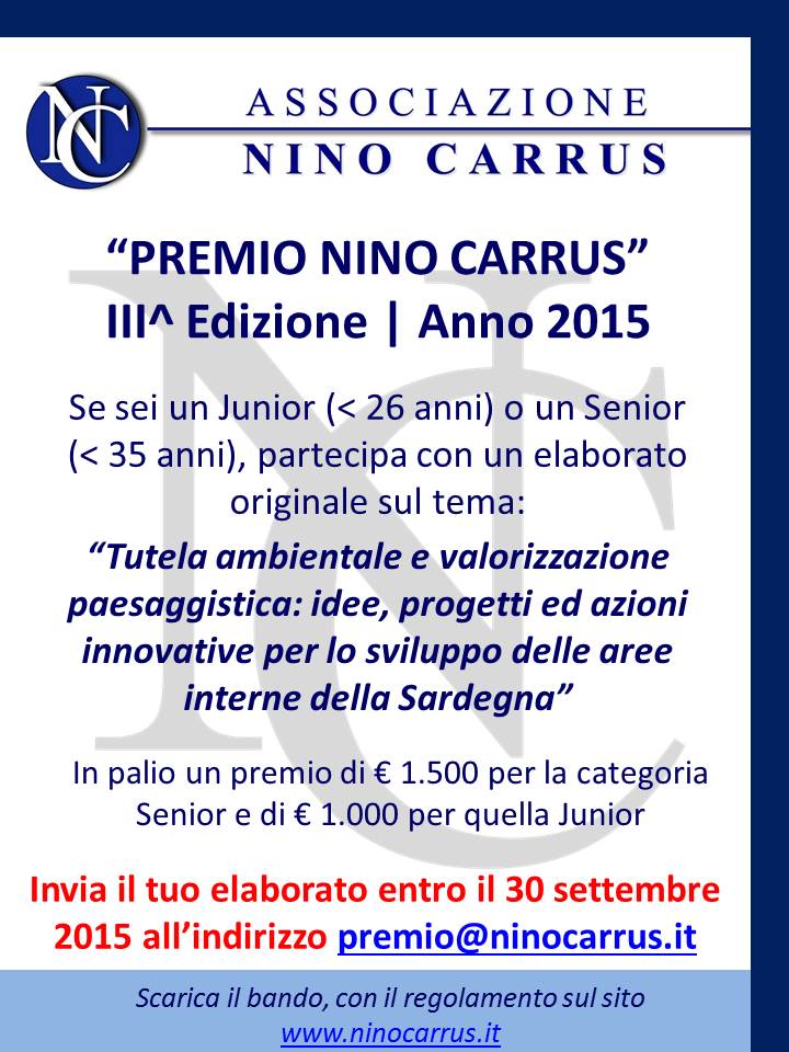 Mancano poco più di tre settimene alla chiusura dei termini per la partecipazione allla terza edizione del Premio Nino Carrus 2015, finalizzato alla realizzazione di un elaborato dal titolo: "TUTELA AMBIENTALE E VALORIZZAZIONE PAESAGGISTICA: IDEE, PROGETTI ED AZIONI INNOVATIVE PER LO SVILUPPO DELLE AREE INTERNE DELLA SARDEGNA"