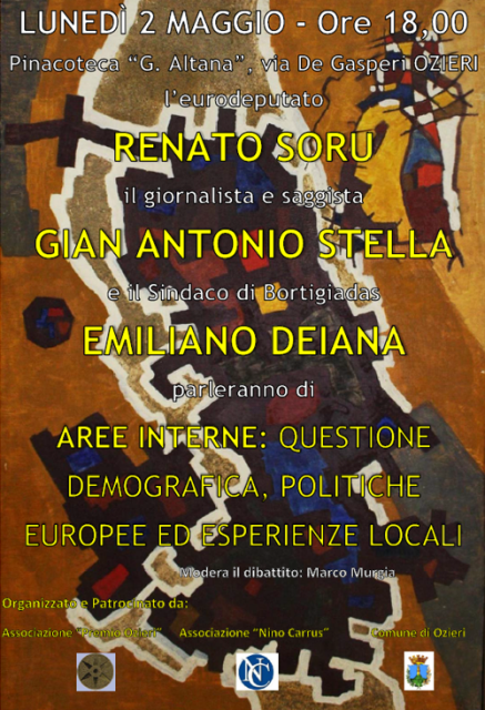 Lunedì 2 maggio ad Ozieri insieme a Giannantonio Stella, Renato Soru e Emiliano Deiana discuteremo di 'Aree interne: questione demografica, politiche europee ed esperienze locali' in occasione del convegno organizzato dall'Associazione Premio Ozieri e dall'Associazione Nino Carrus, con il patrocinio del Comune di Ozieri.