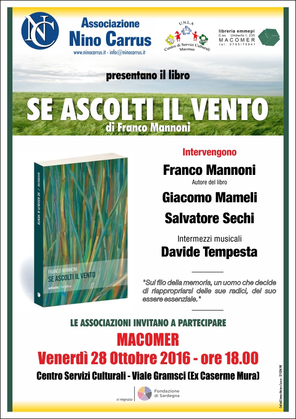 Venerdì 28 ottobre, alle ore 18, presso la sede del Centro Servizi Culturali di Macomer verrà presentato il romanzo di debutto di Franco Mannoni "Se ascolti il vento" che sta riscuotendo in queste prime settimane di presentazione un grande successo editoriale.
