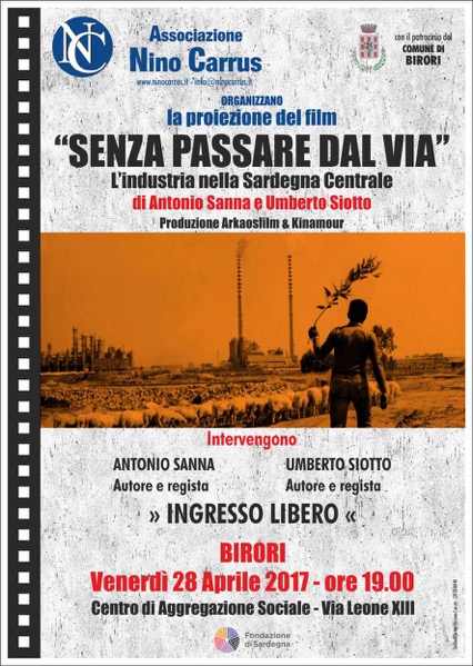 Venerdì 28 aprile alle ore 19 – presso il Centro di Aggregazione Sociale di Birori (Via Leone XXXIII) – verrà proiettato il film documentario dal titolo "Senza passare dal Via. L'industria nella Sardegna Centrale" dei registi nuoresi Antonio Sanna e Umberto Siotto, prodotto da Arkaosfilm & Kinamour, alla presenza degli autori del lungometraggio e del Direttore della Cineteca Sarda Antonello Zanda.
