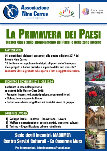 Sabato 3 novembre si concluderà "La Primavera dei Paesi" la prima Masterclass sullo spopolamento dei paesi e delle zone interne. L'incontro sarà introdotto da una breve assemblea di tutti i partecipanti per riflettere assieme su alcuni aspetti rilevati durante i quattro incontri precedenti: impressioni, organizzazione, programmi e suggerimenti per il futuro, modalità e tempi di partecipazione, contenuti e temi di discussione.