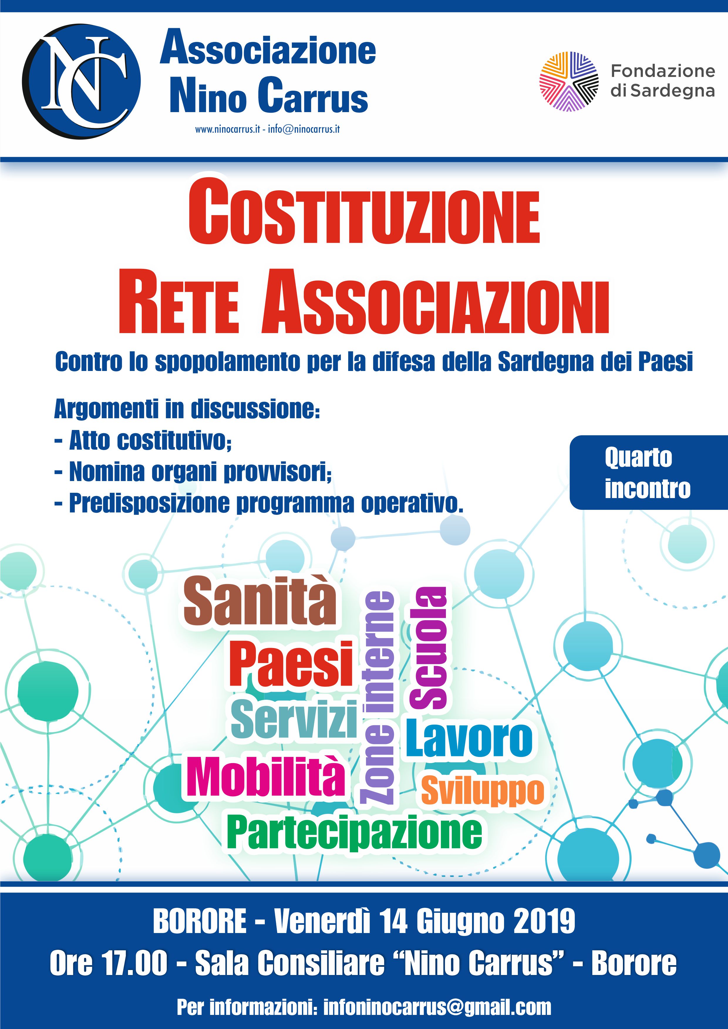 Venerdì 14 giugno alle ore 17, presso la sala consiliare del Comune di Borore intitolata al nostro Nino Carrus, si terrà il quarto incontro per la costituzione della Rete delle Associazioni sarde impegnate da anni a discutere spopolamento delle zone interne e a proporre soluzioni e progetti per il ripopolamento e la rinascita dei nostri paesi.