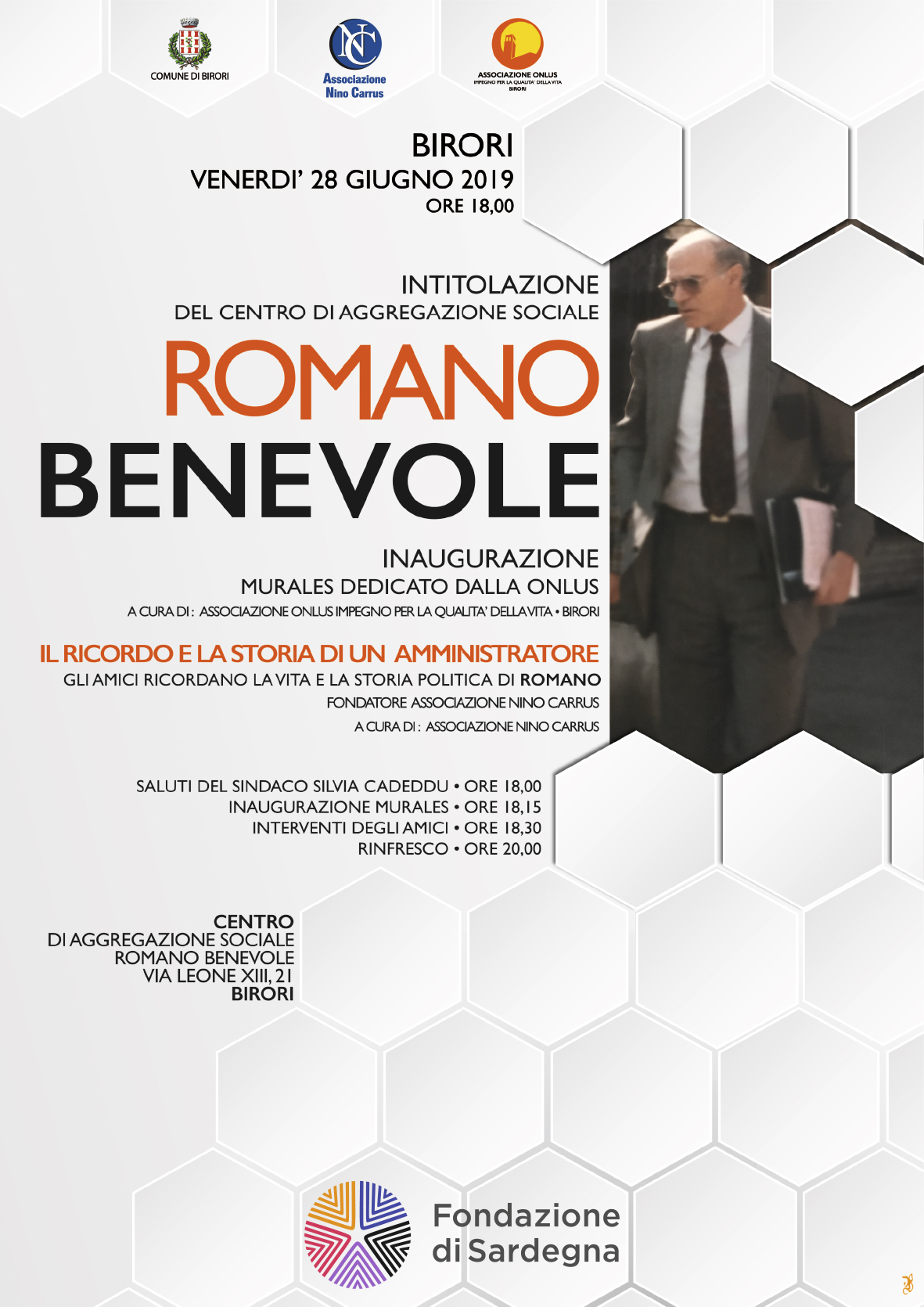 Venerdi 28 giugno alle ore 18 presso il Centro di Aggregazione sociale di Birori intitolato a Romano Benevole da una apposita deliberazione del Consiglio comunale che ha guidato come Sindaco per oltre un trentennio, verrà ricordata la sua figura e la sua intensa e lunga storia di Amministratore: Sindaco del comune di Birori, Presidente della Comunità montana e della Usl Marghine e Planargia, Vice presidente del Consorzio industriale di Macomer.