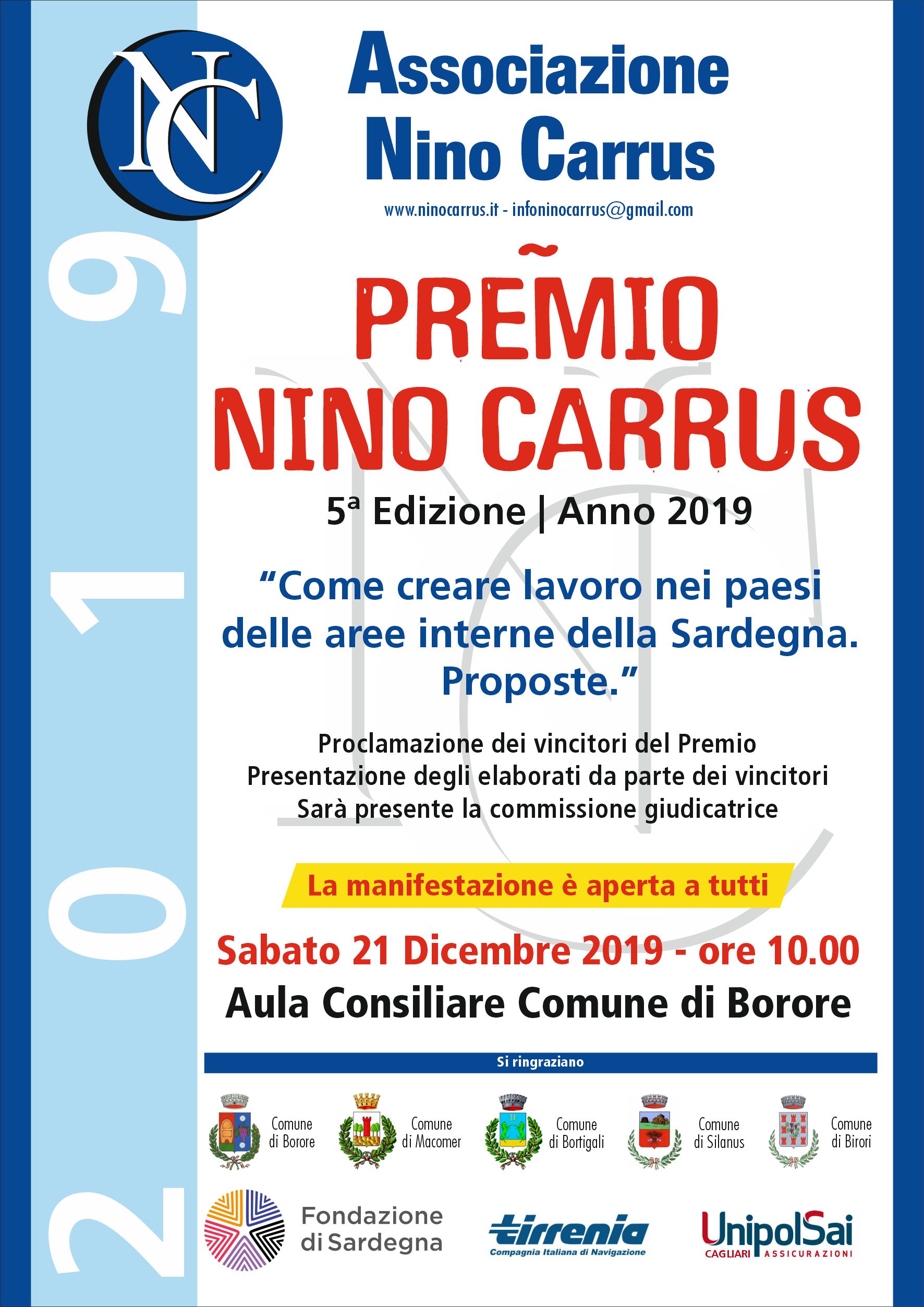 Sabato 21 dicembre 2019 alle ore 10, presso la Sala consiliare del Comune di Borore si svolgerà la premiazione dei tre vincitori della "Quinta edizione del Premio Nino Carrus 2019" dedicato al tema " Come creare lavoro nei paesi delle aree interne della Sardegna. Proposte".