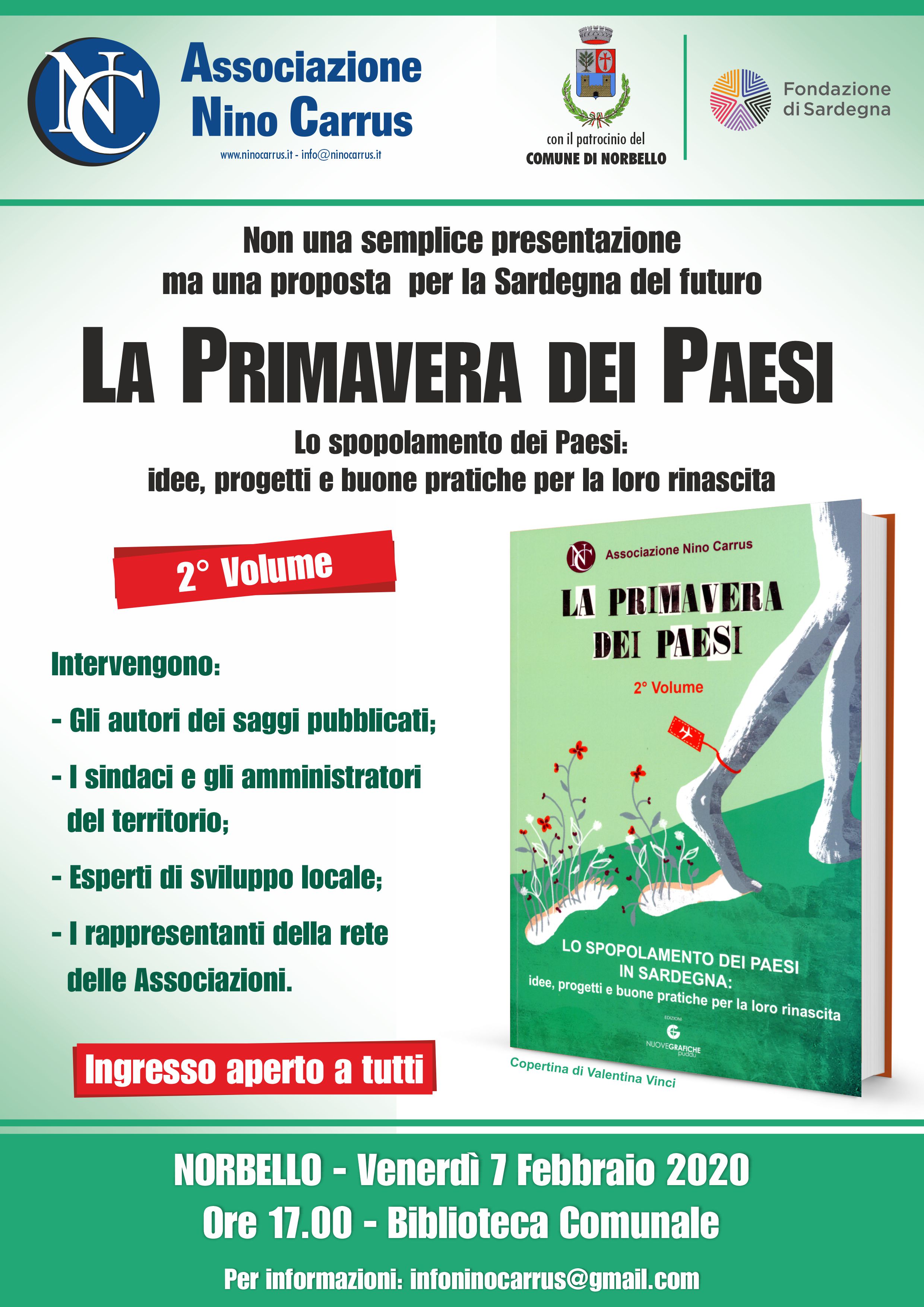 Venerdì 7 febbraio alle ore 17 presso la Biblioteca comunale l'Associazione Nino Carrus , con il patrocinio del comune di Norbello, organizza un incontro dibattito per la presentazione del secondo volume dal titolo "La Primavera dei paesi. Lo spopolamento dei paesi in Sardegna: idee, progetti e buone pratiche per la loro rinascita."