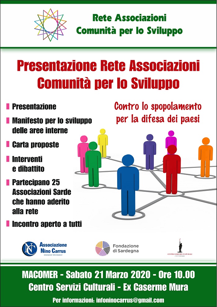Sabato 21 marzo alle ore 10 presso il Centro Servizi Culturali di Macomer verrà presentata ufficialmente "La Rete delle Associazioni. Comunità per lo sviluppo" per concludere un percorso iniziato a Borore, con un primo incontro esplorativo, il 19 ottobre 2018.