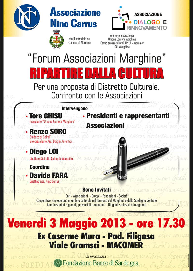 Venerdì 3 maggio alle ore 17,30 presso il Padiglione Filigosa – Ex Caserme Mura di Macomer l'Associazione "Nino Carrus" e l'Associazione " Dialogo e Rinnovamento" organizzano un Forum sul tema " Ripartire dalla cultura. Per una proposta di distretto culturale. Confronto con le Associazioni." In collaborazione con L'Unione dei Comuni, con il Centro Servizi culturali e con il Gal Marghine.