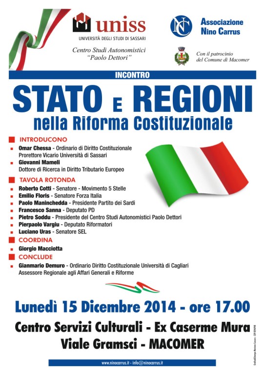 Lunedì 15 dicembre 2014 alle ore 17,00, presso il Centro Servizi Culturali di Macomer si terrà una Tavola rotonda su un tema molto attuale che interessa non solo la Sardegna ma l'intero Paese "Stato e Regioni nella riforma Costituzionale".