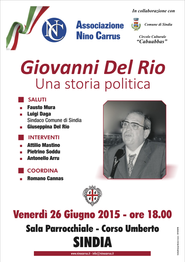 L'Associazione Nino Carrus in collaborazione con il Comune di Sindia e con il Circolo Culturale "Cabuabbas" organizza per venerdì 26 giugno 2015 a Sindia un incontro per raccontare la storia politica del "Presidente Giovanni Del Rio". Autorevoli relatori, quali Pietrino Soddu, Attilio Mastino e Antonello Arru, con il coordinamento del giornalista Romano Cannas, ci accompagneranno nel cammino di questa storia. Vi aspettiamo alle ore 18,00 presso la sala parrocchiale di Sindia, in corso Umberto.