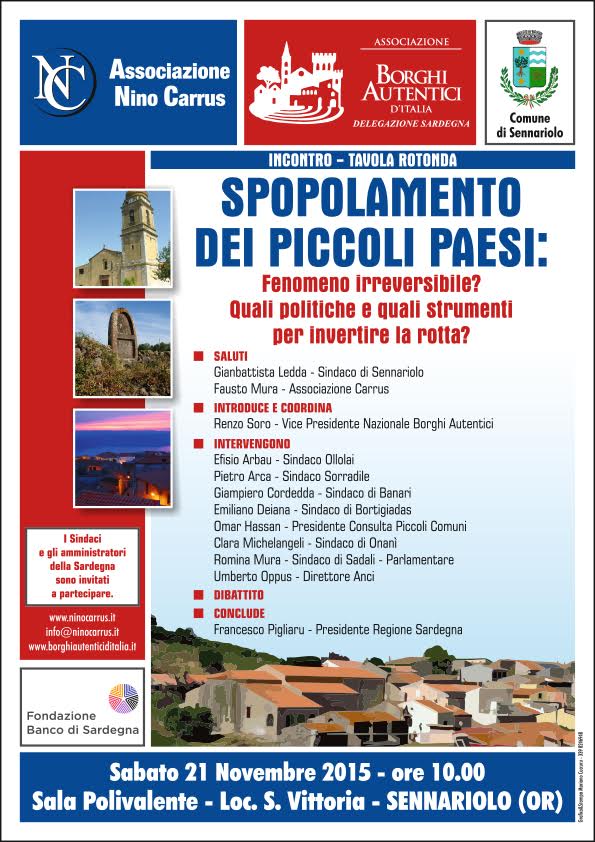 L’Associazione Nino Carrus e l’Associazione Borghi Autentici d’Italia organizzano per sabato 21 novembre 2015 (ore 10,00), nella sala polivalente di del borgo oristanese di Sennariolo (Località S. Vittoria) una tavola rotonda sul tema Spopolamento dei piccoli paesi. Fenomeno irreversibile? Quali politiche e quali strumenti per invertire la rotta?".
