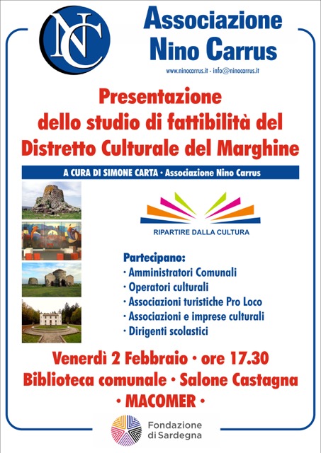 Il prossimo venerdì 2 febbraio 2018, alle ore 17.30 presso la biblioteca comunale (Salone Castagna) di Macomer, l'Associazione Nino Carrus presenta lo studio di fattibilità del Distretto culturale del Marghine.